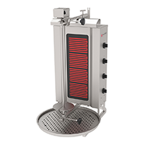 Гриль для шаурмы Tatra TDM E 4T предназначен для обжарки большого количества различных видов мяса и птицы при приготовлении начинки из рубленного мяса для шаурмы и других блюд на предприятиях общественного питания и торговли. Модель оснащена электромеханической панелью управления и верхним приводом вращения вертела. Корпус выполнен из нержавеющей стали.