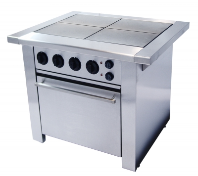 4 конфорки КЭ -0,12,4 4-х позиционных переключателя, съемные боковые полки плиты, увеличенная духовка GN 2/1, 4 направляющих под противни и гастроемкости, 2 термостата 50-300С, исполнение духовки - внутри сталь, снаружи нержавеющая сталь, дверь духовки глухая, усиленные шарниры двери духовки, комплектация духовки 2 противнями из стали.