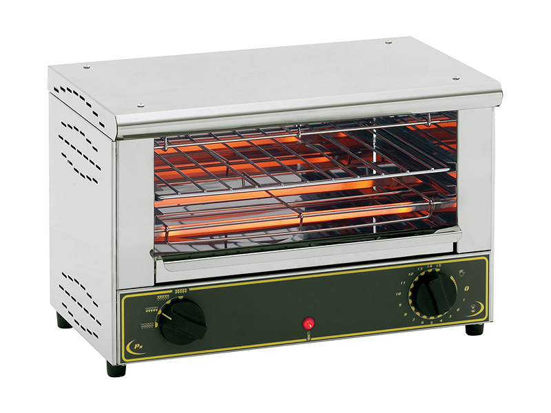 Предназначен для приготовления и разогрева тостов, горячих бутербродов и закусок. Кварцевые нагревательные элементы. Максимальная температура нагрева – 1050°С. Четырехпозиционный переключатель нагрева. Таймер на 15 минут, с возможностью отключения (для непрерывного процесса приготовления). Съемный поддон для сбора лишнего жира и крошек. Корпус из нержавеющей стали. Производительность – 150 шт/ч.