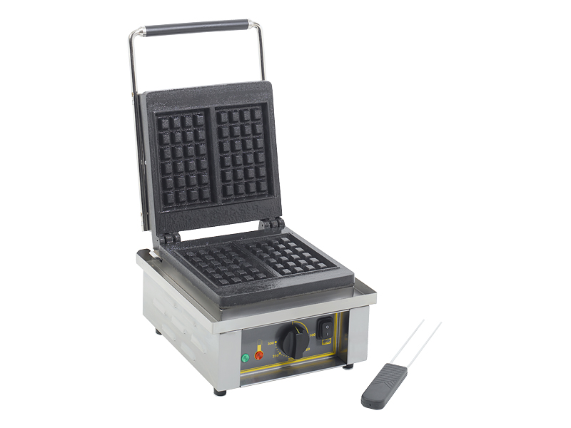 Вафельница предназначена для выпечки объемных вафель (такие вафли подаются как самостоятельное блюдо или как десерт с наполнением фруктами, джемом, сливками или шоколадом), можно выпекать из замороженных полуфабрикатов. 1 пара рабочих поверхностей. 2 вафли. Нагрев осуществляется одновременно сверху и снизу, поверхность нагревается равномерно. Рабочие поверхности изготовлены из массивного чугуна. Время приготовления вафель: около 2,5 мин. Терморегулятор позволяет устанавливать температуру от 0 до 300 С. Корпус выполнен из нержавеющей стали. Ручки выполнены из термостойкого материала. Съемный поддон вокруг основания нижней рабочей поверхности служит для сбора избыточного теста и облегчает очистку. Оснащена двухпозиционным переключателем, термостатом и двумя сигнальными лампами.