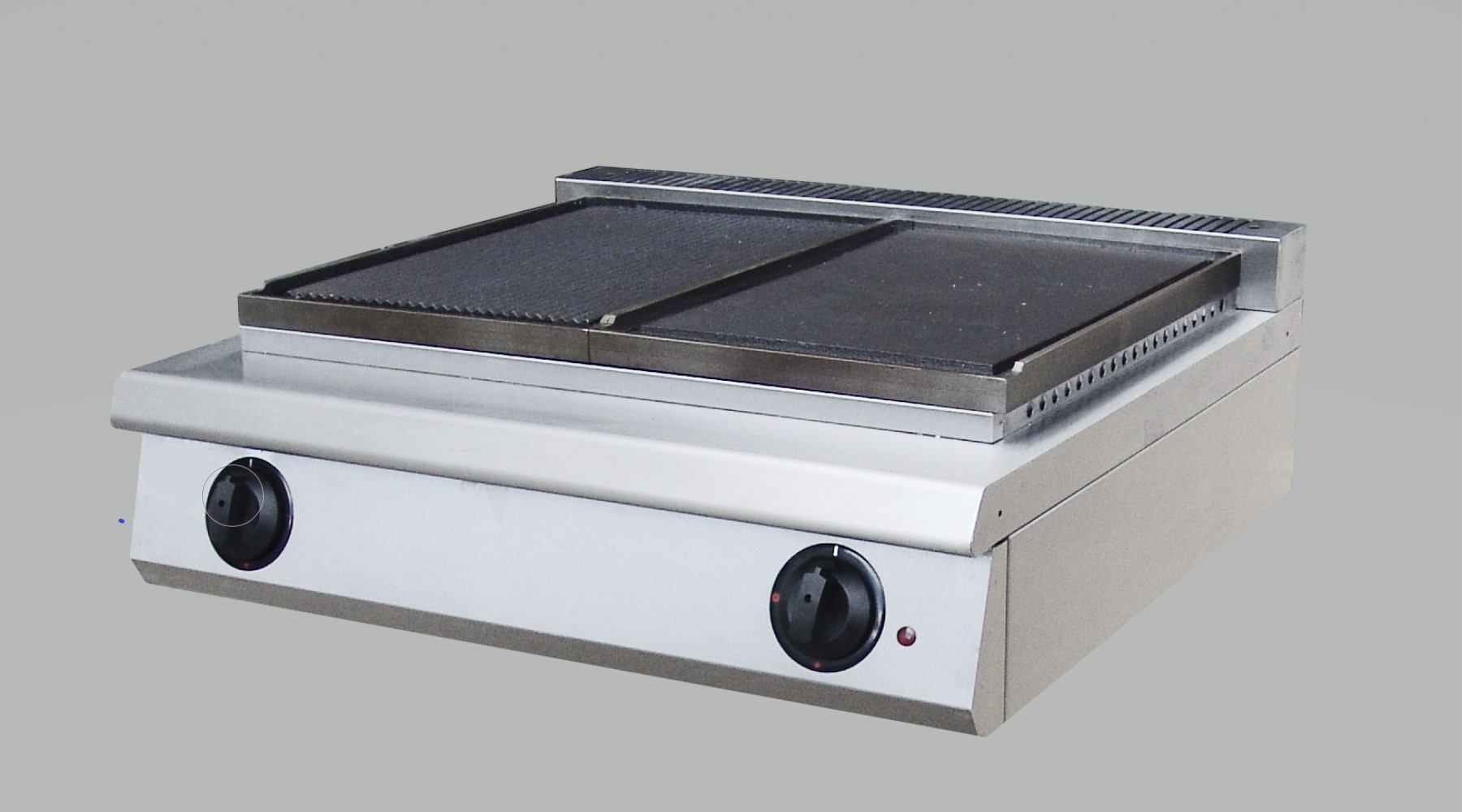800x800x340, 93 кг, 2 жарочные поверхности (гладкая, рифленая) из чугуна, 2 пакетных выключателя(4 позиции), рабочая температура ~300C, мощность 6 кВт, исполнение полностью из нержавеющей стали, габариты брутто 900х900х600